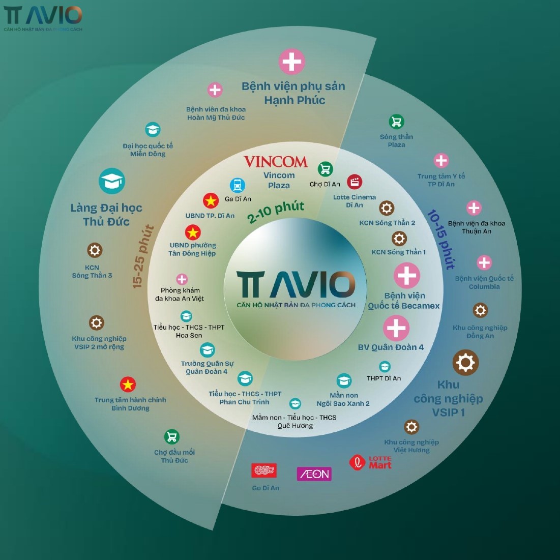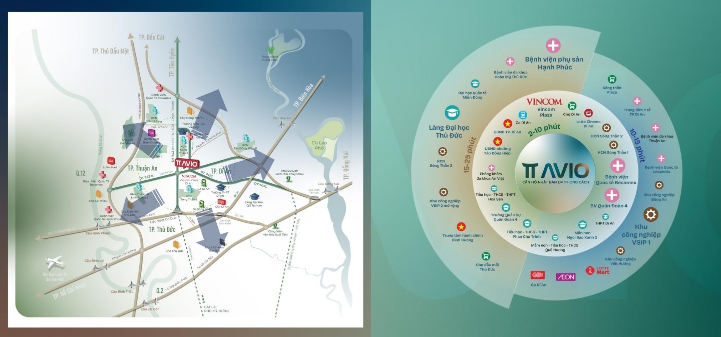 TT AVIO tọa lạc tại vị trí đắc địa nơi giao điểm phát triển kinh tế năng động và cửa ngõ kết nối vùng kinh tế trọng điểm phía Nam. Hạ tầng đồng bộ, thông qua các tuyến đường chính, TT AVIO kết nối thuận tiện với các đô thị đang phát triển không ngừng, giúp cư dân “đi đâu cũng tiện, đến đâu cũng gần” từ mọi hướng.